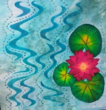 Pink Waterlilies Hand dyed silk background with hand painted flowers and leaves and hand embroidery and stencilled ripples Sold |